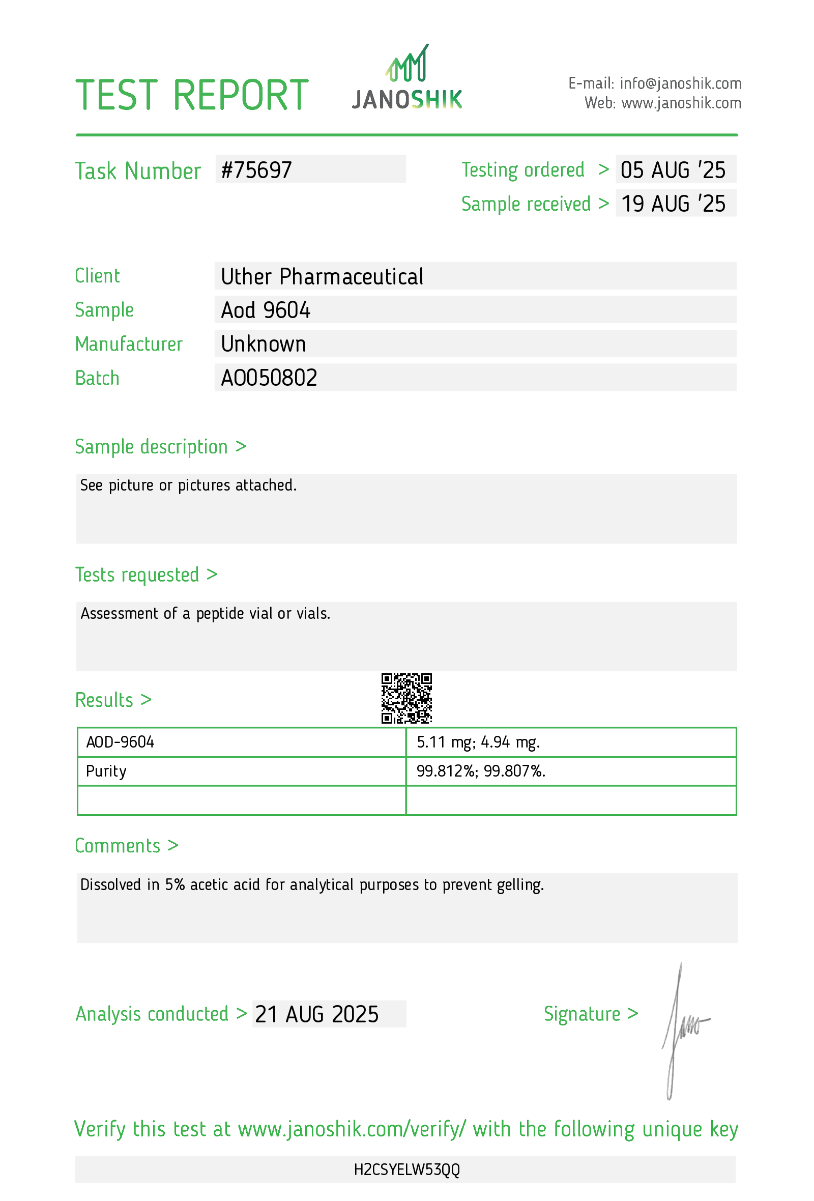 AOD-9604 (Anti-Obesity Drug 9604) er et syntetisk peptid som består av en modifisert sekvens fra den aktive C-terminalen av humant veksthormon (hGH) – aminosyrene 176–191. Dette peptidet er spesielt utviklet for å selektivt stimulere lipolyse (fettforbrenning) uten å påvirke blodsukkernivået eller insulinproduksjonen, noe som gjør det av spesiell interesse for forskning relatert til fedme, metabolisme og kroppssammensetning .